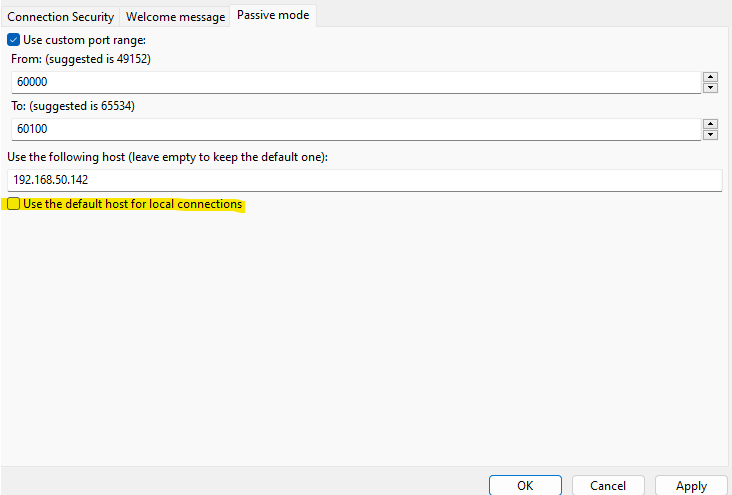 add chain=dstnat protocol=tcp dst-port=60000-60100 in-interface-list=WAN action=dst-nat to-addresses=192.168.88.254 to-ports=60000-601003. Passive mode filezilla server